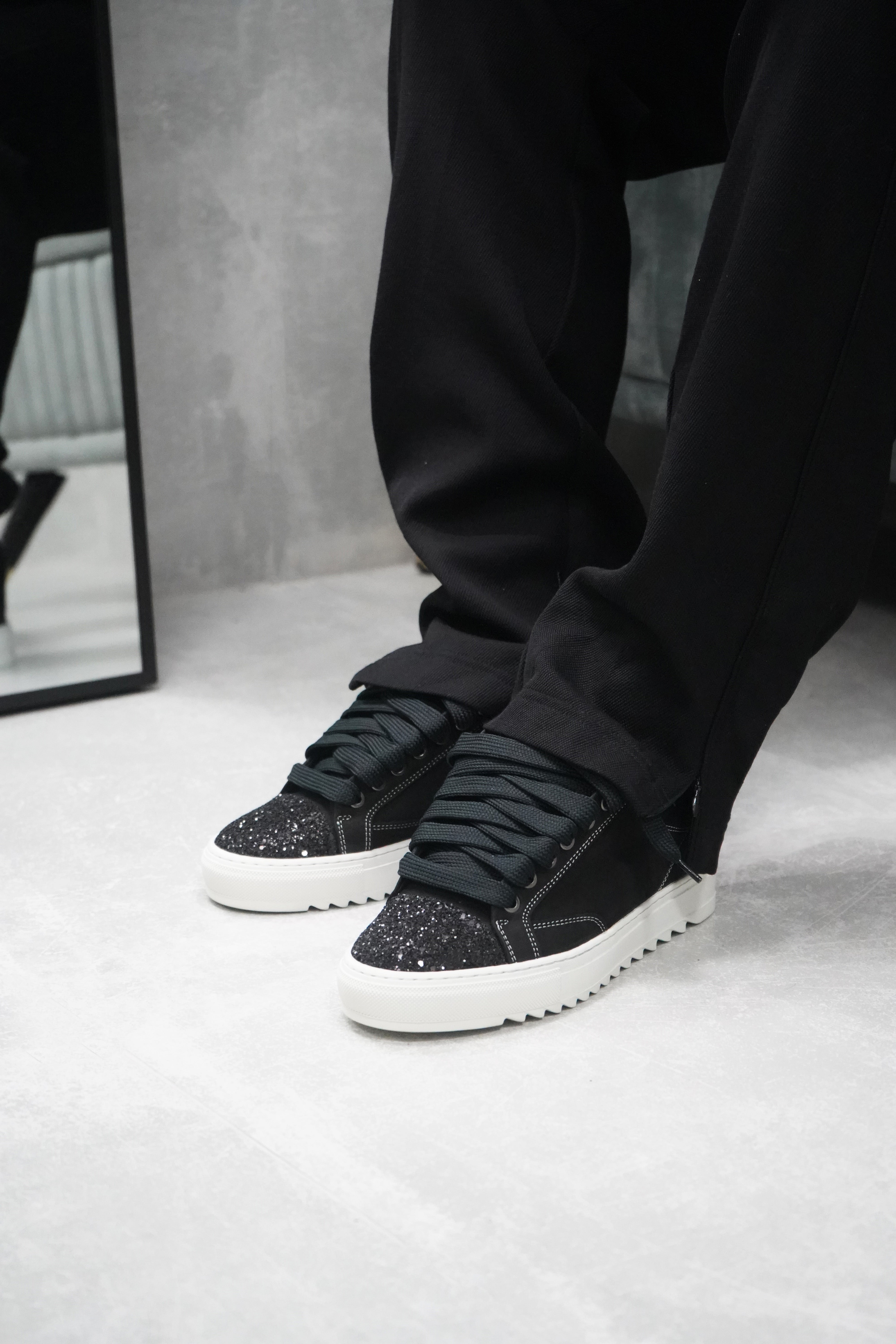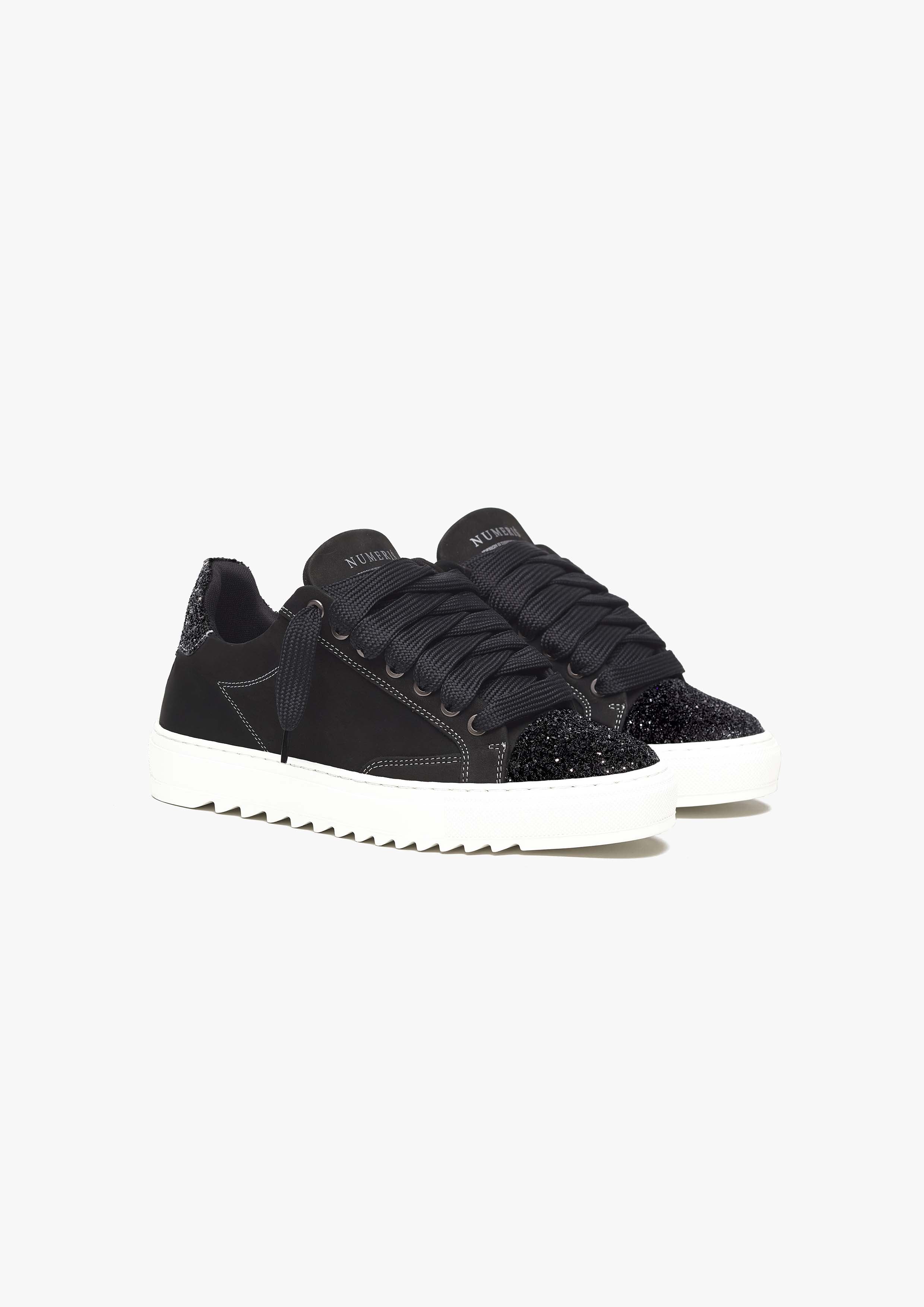 La Crystal è dotata di una tomaia in nabuk nero di alta qualità con cuciture bianche impeccabili e una punta in cristallo. L’interno della sneaker è rivestito con un collarino imbottito che offre un comfort impareggiabile. Il tocco finale è il nostro logo Numeriś sul tallone della scarpa, con il nostro slogan per questo modello: «Design is thinking made visual» stampato sulla linguetta.