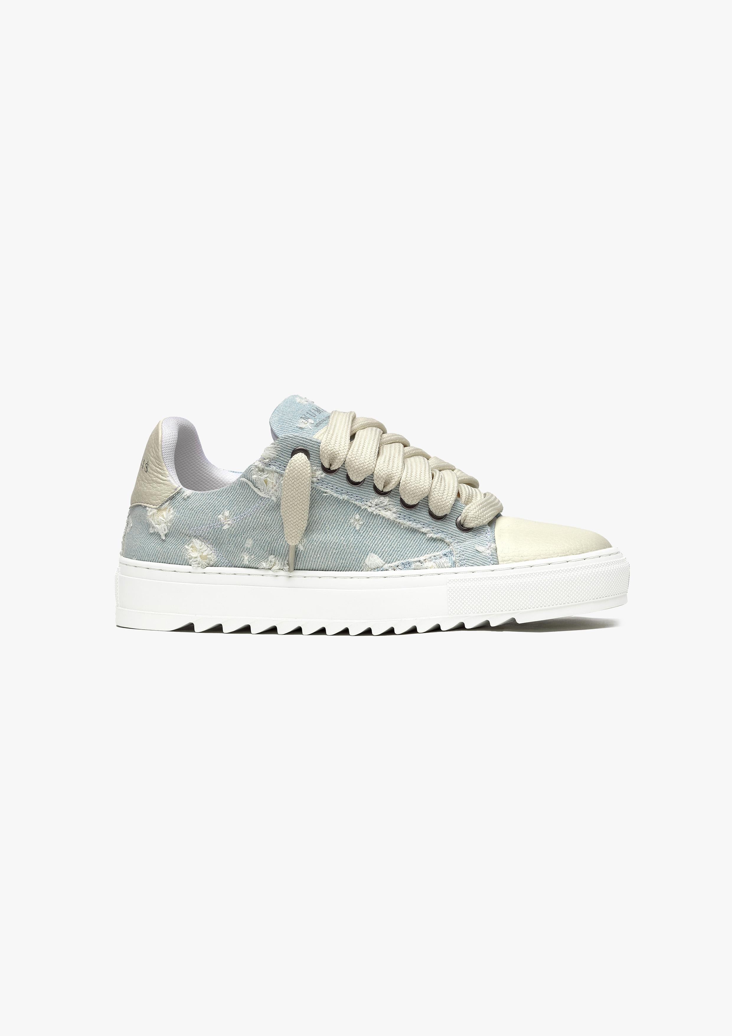 Realizzata con una meticolosa attenzione ai dettagli, la tomaia in denim leggero con effetto usurato su misura rende ogni paio un’opera d’arte unica, poiché nessuna scarpa presenterà lo stesso motivo consumato.