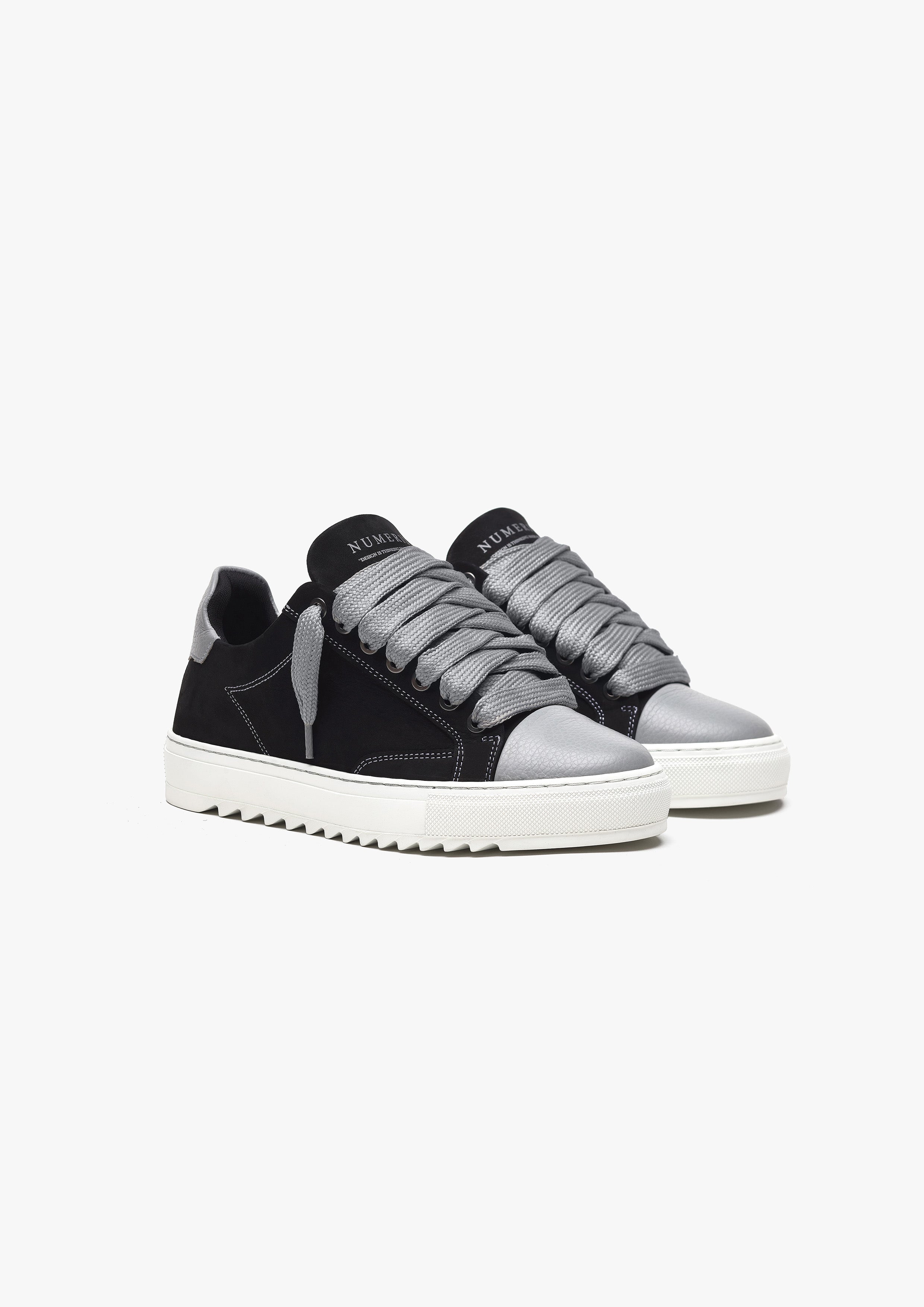 Ogni cucitura e ogni dettaglio sono stati accuratamente progettati in un atelier parigino. La sneaker Atelier presenta una tomaia in nabuk nero di alta qualità con cuciture bianche impeccabili e una punta in pelle pieno fiore grigia, iconica. L’interno della scarpa è dotato di una fodera imbottita al colletto che offre un comfort impareggiabile. I dettagli finali includono il nostro logo Numeriś sul tallone, accompagnato dallo slogan di questo modello: «Design is thinking made visual», stampato sulla linguetta.
