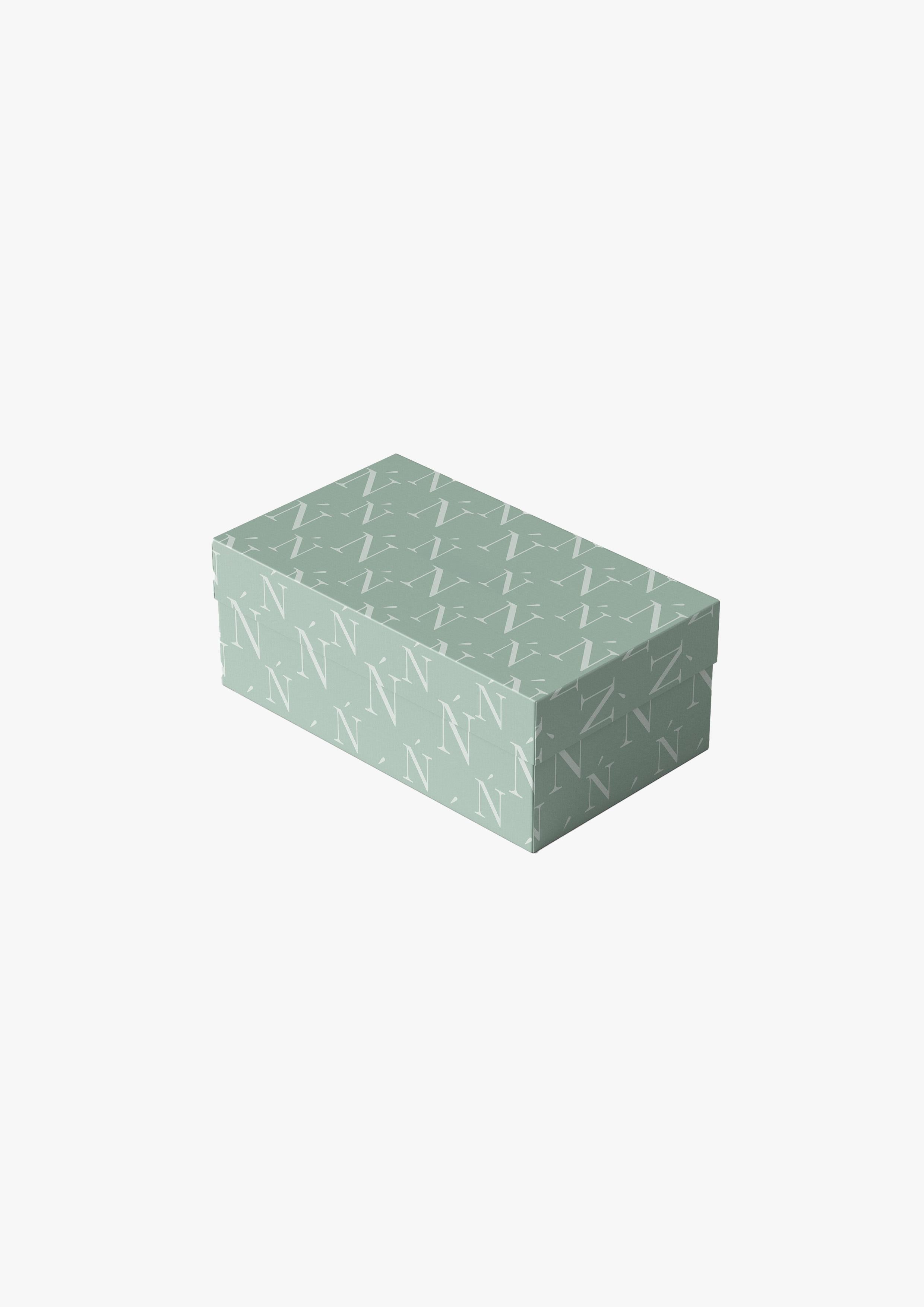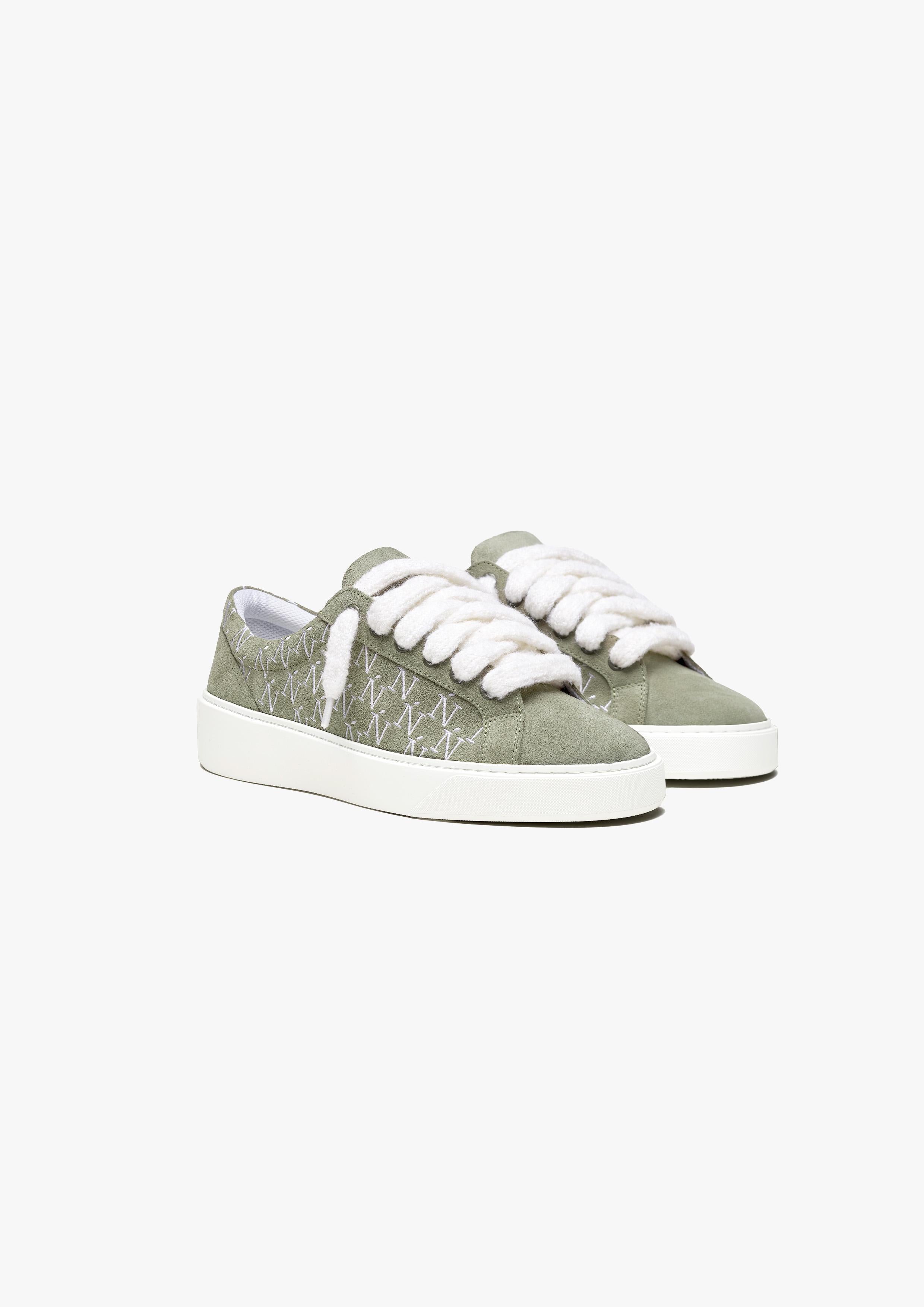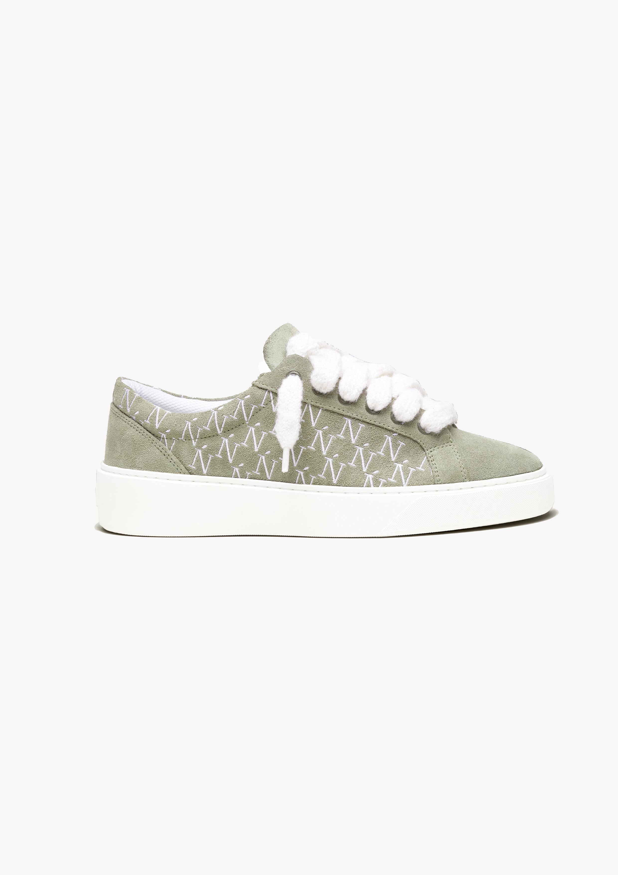 La sneaker Sigńet est dotée d'un daim vert clair italien, de lacets blancs en mohair de 10 mm et de panneaux latéraux assortis, accompagnés de notre élégant logo monogramme Ń brodé à la main. L'intérieur de la sneaker présente une doublure de col blanche offrant un confort inégalé. La tige repose parfaitement sur notre toute nouvelle semelle en caoutchouc complexe, exclusivement fabriquée pour Sigńet. Notre logo argent distinct est positionné sur la languette.