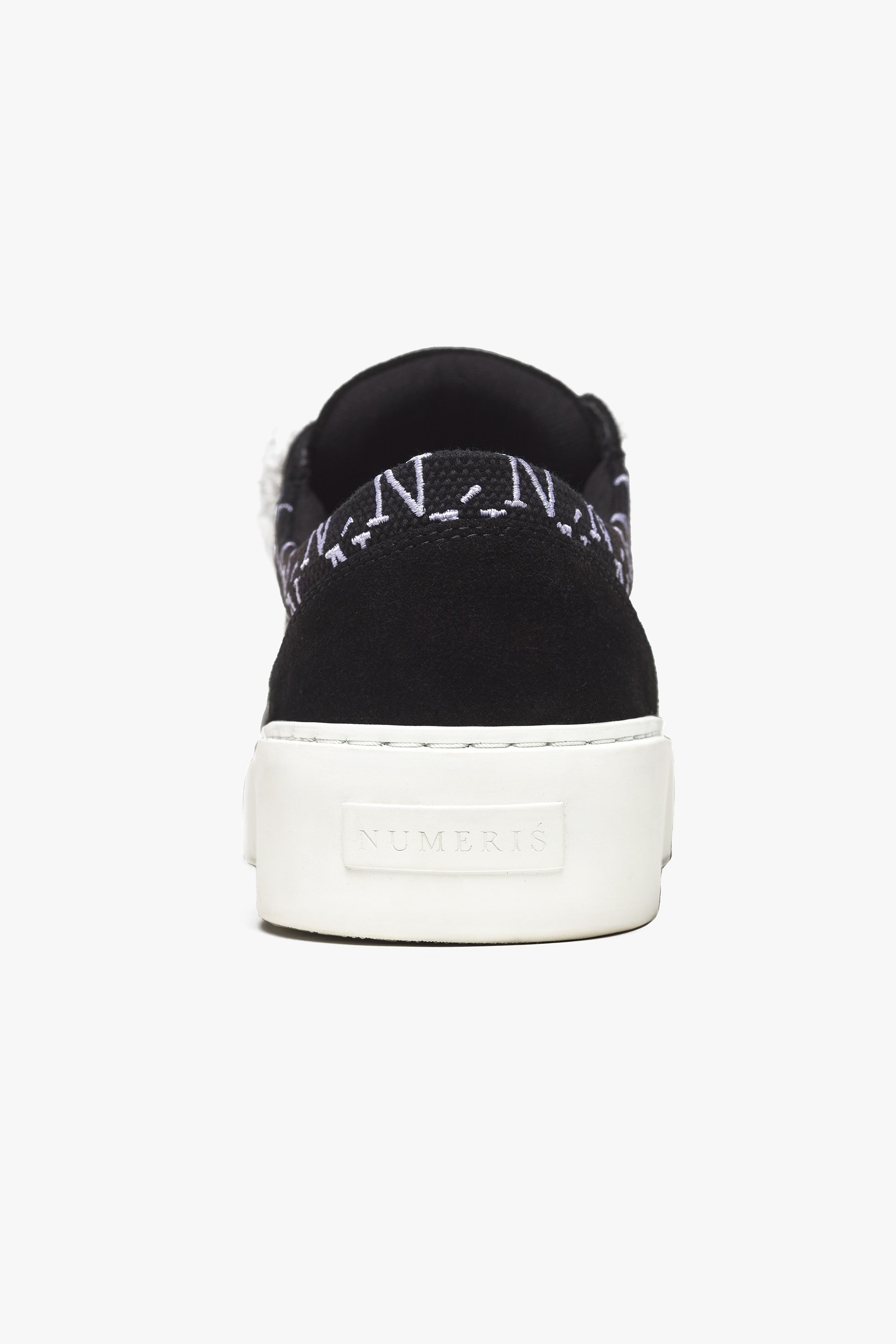 La sneaker Sigńet est dotée de daim noir italien, de lacets blancs moelleux de 20 mm, de panneaux latéraux en toile noire accompagnés de notre élégant logo monogramme Ń brodé à la main. L'intérieur de la sneaker est doté d'une doublure de col noire offrant un confort inégalé. La tige repose parfaitement sur notre toute nouvelle semelle en caoutchouc complexe, fabriquée exclusivement pour Sigńet. Notre logo argenté distinctif est positionné sur la languette.